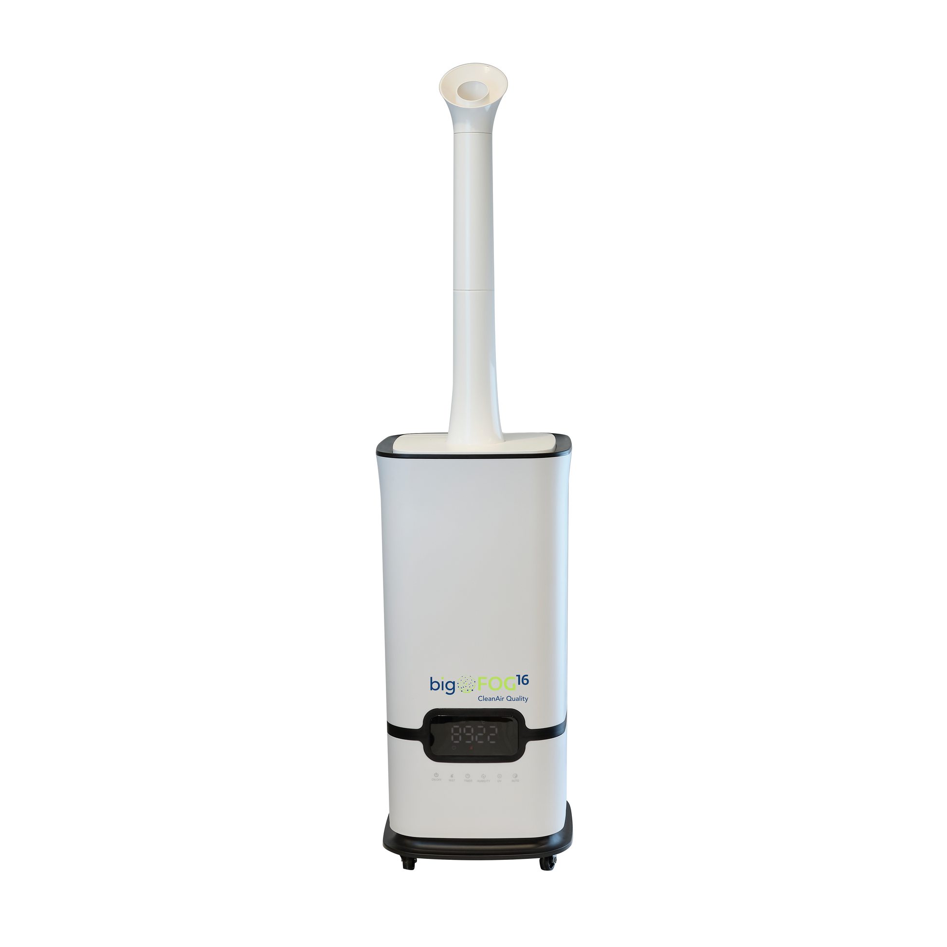 Der bigFOG 16 ist ein zukunftsorientiertes, kompaktes Ultraschall-Verneblungssystem zur Erzeugung eines luftgetragenen Aerosols für die kontinuierliche Luft- und Oberflächenhygienisierung in Anlehnung an die DIN EN 17272.